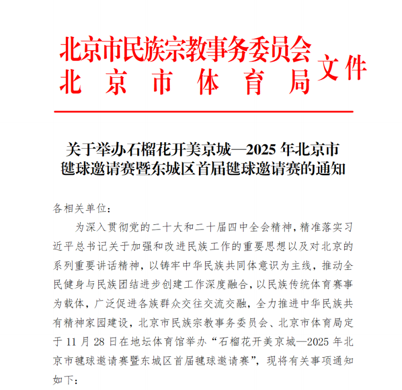关于举办石榴花开美京城—2025年北京市 毽球邀请赛暨东城区首届毽球邀请赛的通知