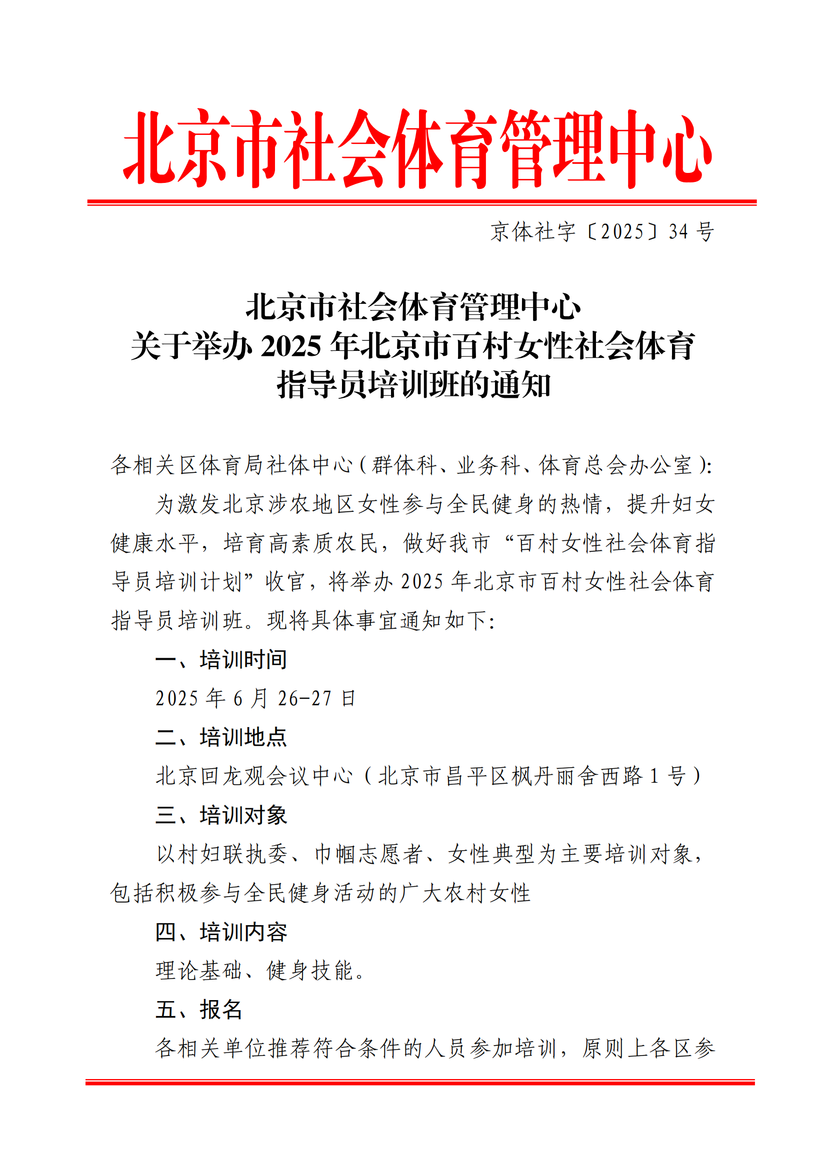 北京市社会体育管理中心关于举办2025年北京市百村女性社会体育指导员培训班的通知