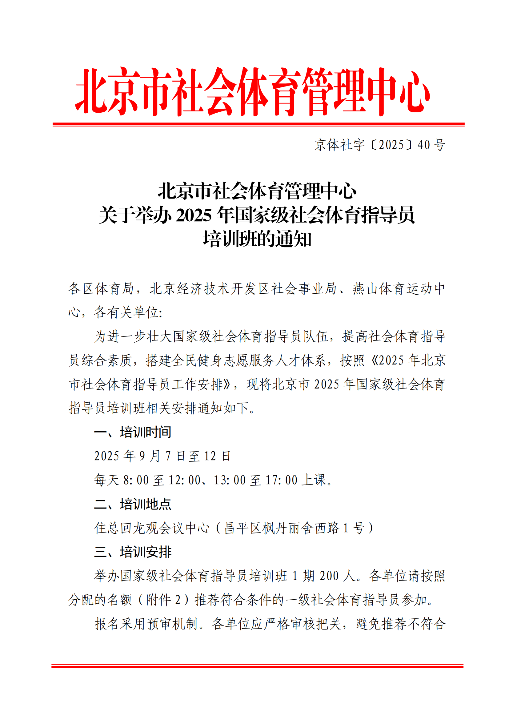 北京市社会体育管理中心关于举办2025年国家级社会体育指导员培训班的通知