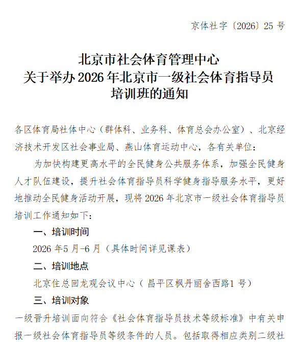 北京市社会体育管理中心关于举办 2026 年北京市一级社会体育指导员培训班的通知